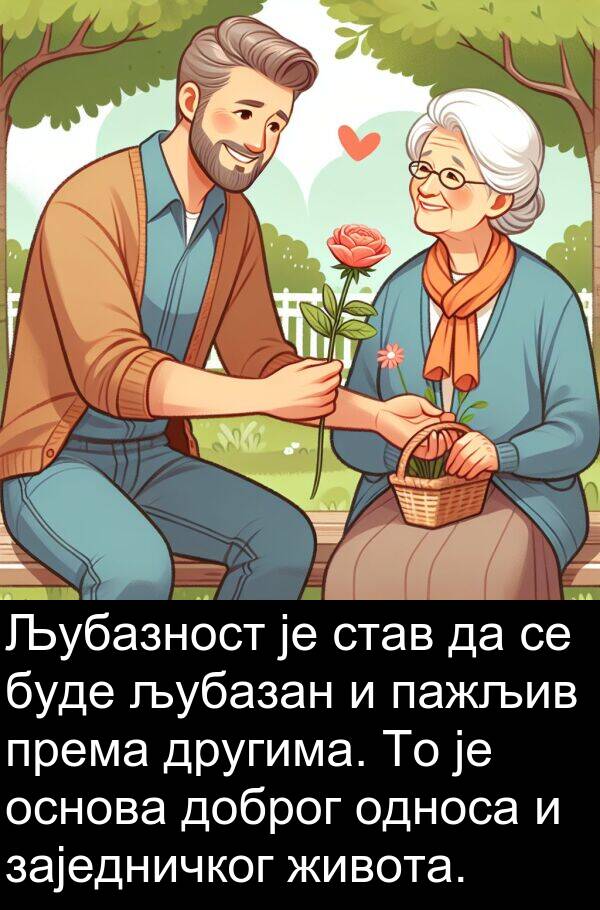 Љубазност је став да се буде љубазан и пажљив према другима. То је основа доброг односа и заједничког живота.