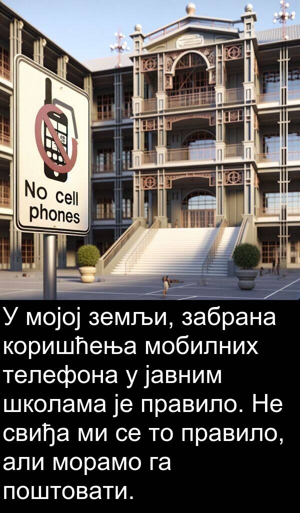 У мојој земљи, забрана коришћења мобилних телефона у јавним школама је правило. Не свиђа ми се то правило, али морамо га поштовати.