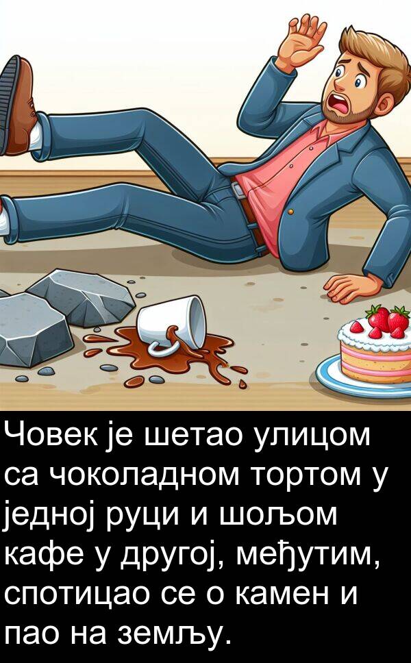 Човек је шетао улицом са чоколадном тортом у једној руци и шољом кафе у другој, међутим, спотицао се о камен и пао на земљу.